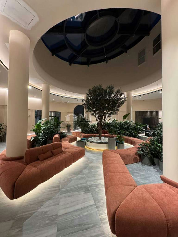 В центральном холле размещаются: ресепшн, мини-переговорные, пространство для коворкинга и озелененная зона ожидания с деревьями, кустарниками и уютными креслами. На первом этаже также находятся лаундж-зона, детские игровые комнаты и помещения для хранения детских колясок и спортивного инвентаря.