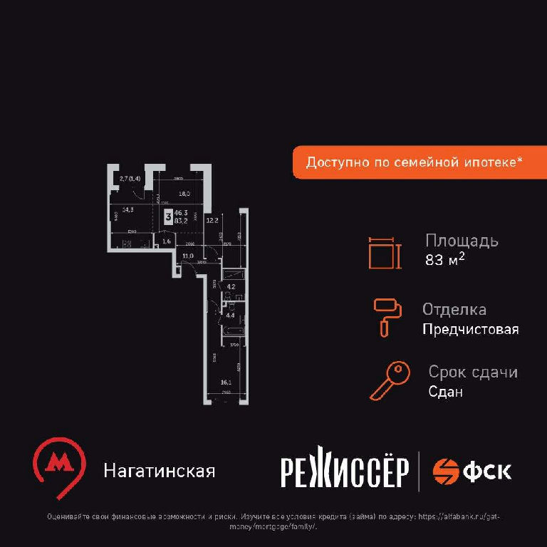 Жилая площадь 46.3 м2, кухня 14.3 кв. м, ремонта нет, окна выходят во двор.