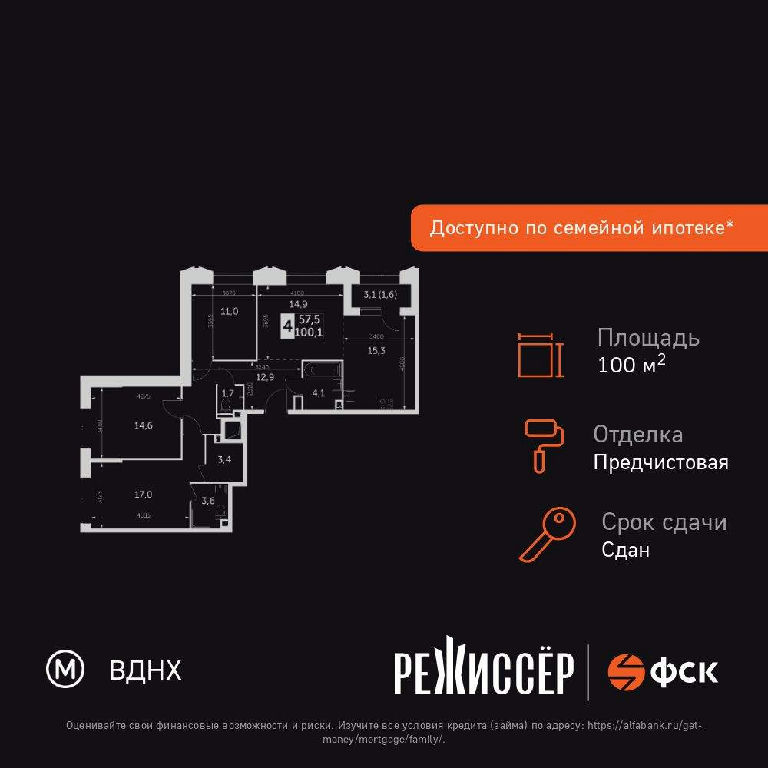 Жилая: 57,5 м2